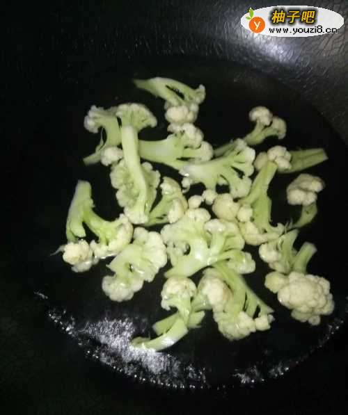 3取适量的花菜,将花菜切成小块,清洗干净,再放锅里煮开,捞出;