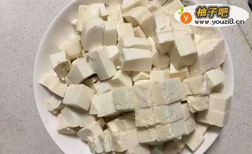 第一,准备好豆腐,切好放置盘中,备用