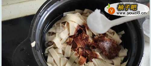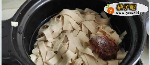 2放入千张和火锅底料。