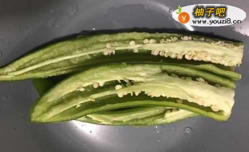 2将青椒对半切开,去除里面的籽。