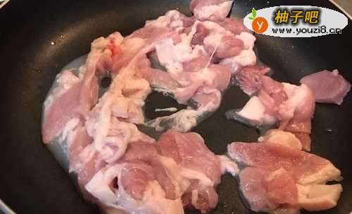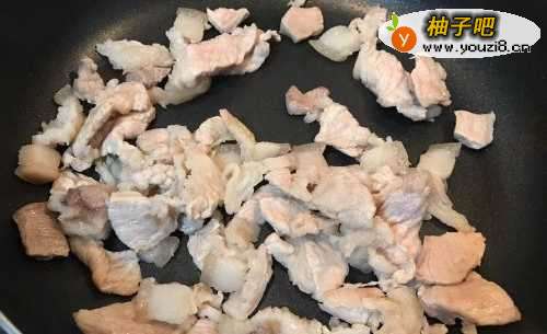 5待五花肉小火炒至变色后,继续煸炒至微出油。