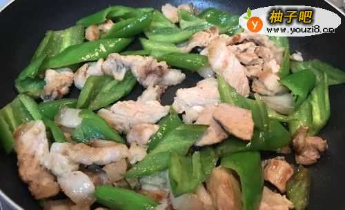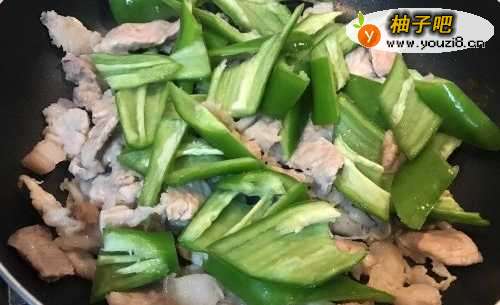 6倒入青椒块,中小火慢慢煸炒至青椒变软。