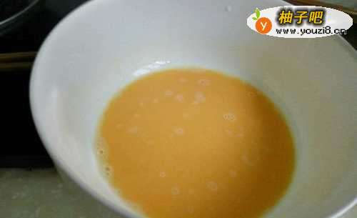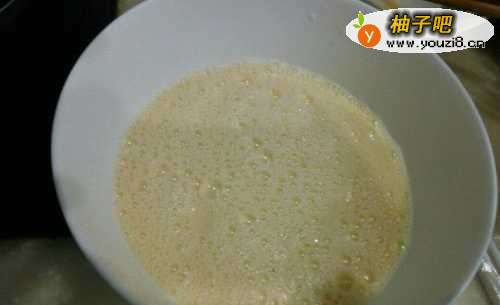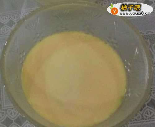 3将牛奶倒进搅拌好的鸡蛋内,再次搅拌均匀。