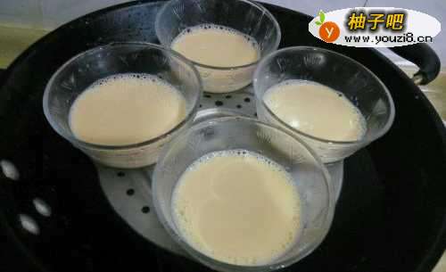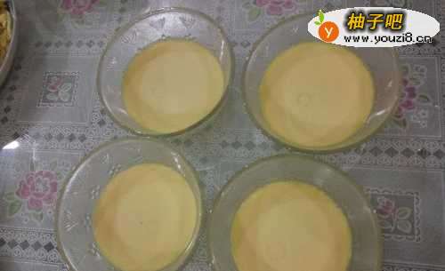 4将搅拌好的鸡蛋牛奶汁分别倒入4个玻璃碗中,也可以用玻璃杯;最好有盖子盖上,如果没盖子则用保鲜膜封住碗口。将装了鸡蛋牛奶汁的玻璃碗,放入铁锅中。