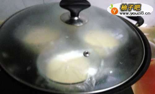 5铁锅内放水,盖上锅盖;烧开,并调至小火,煮15分钟。煮时可将锅盖留个缝隙,以防锅里的温度太高,以至于蒸出后布丁有孔,不好看。