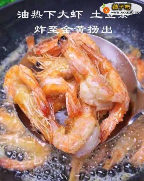 2放入处理好的大虾煸炒至虾身弯曲变红,土豆条裹上淀粉炸变色即可。