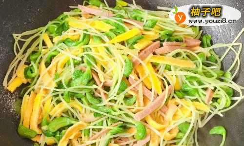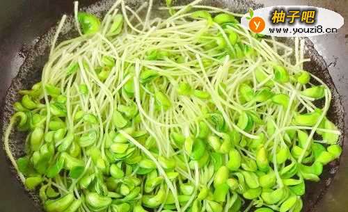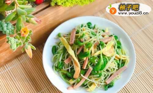 8火腿煸炒出香味,将焯水后的黑豆苗和鸡蛋丝一同下锅爆炒。鸡蛋丝是熟的,焯水后的黑豆芽也已经呈半熟状态,所以必须大火爆炒,动作一定要快,否则黑豆苗的根茎炒太久口感就不脆嫩了。