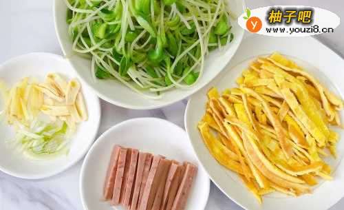 4焯水后的黑豆苗迅速捞出过凉水,冷热水交替让黑豆苗的口感更脆嫩爽口。将柴鸡蛋磕入碗中用筷子均匀打散,因为黑豆苗是细长的,所以火腿最好也切丝别切片,最后将葱姜蒜切成细丝备用。