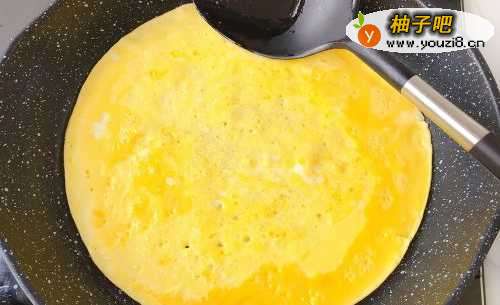 5取平底锅开火热锅至掌心有灼热感,倒入适量花生油,油热改小火,将搅拌均匀的鸡蛋液像摊煎饼一样倒入平底锅,我家的锅不大,两个鸡蛋的蛋液正好将锅底铺满,小火加热将蛋液摊至表层凝固,鸡蛋饼的底色也煎熟了。