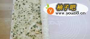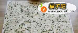 7案上抹些油,将饧好的面团擀开(不用干粉,只用油,这叫做油案),然后均匀地抹上过程“6”调的葱油酥。