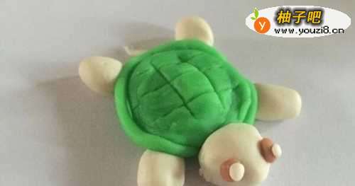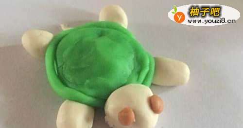 5乌龟的身体部分已经做好了,下面就用白色的橡皮泥做出乌龟的四肢、脑袋、小尾巴。搓的时候,肢体最好是一致的,脑袋可以稍微大一点的,尾巴细细的就好了,见下图展示。