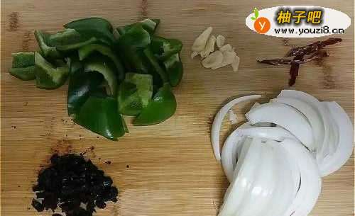 2蒜切片,豆豉用菜刀拍扁,青椒切角,洋葱切条,辣椒去籽切条备用。