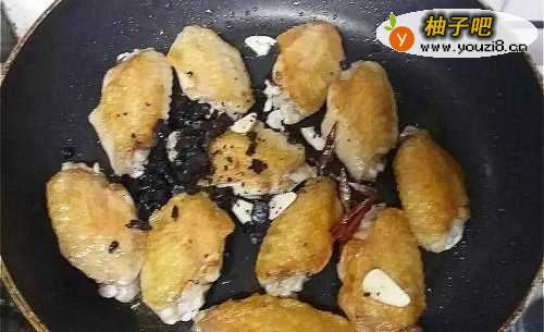 3热油锅,用中火慢煎鸡翅至两面金黄,加蒜、豆豉、辣椒拌炒,盖上锅盖煮熟。