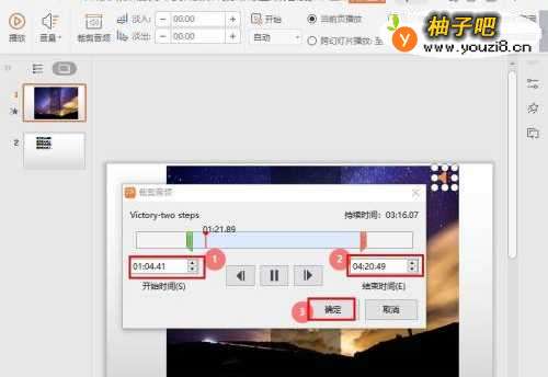 3在“裁剪音频”对话框中,设置【起止时间】选择播放内容,然后点击【确定】;