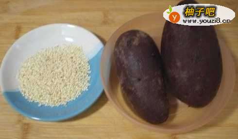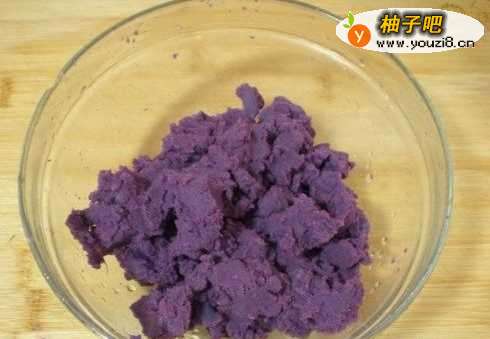 1.紫薯洗净后蒸熟,待不烫手后撕去皮,捣碎成泥;