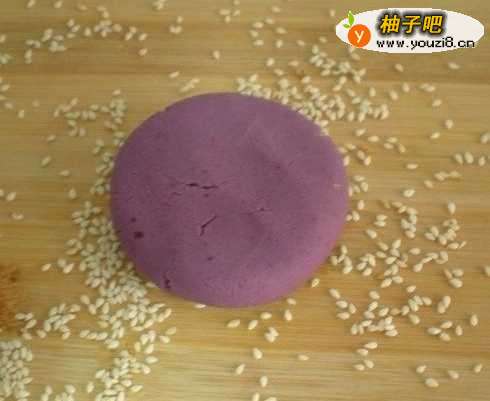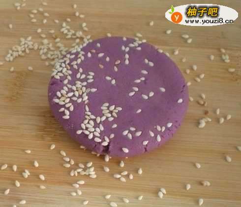 55.在案板上撒上一些白芝麻,将小圆饼放在芝麻上,用手轻轻地按压,使小圆饼的表面沾上芝麻,紫薯饼的生坯就做好了;