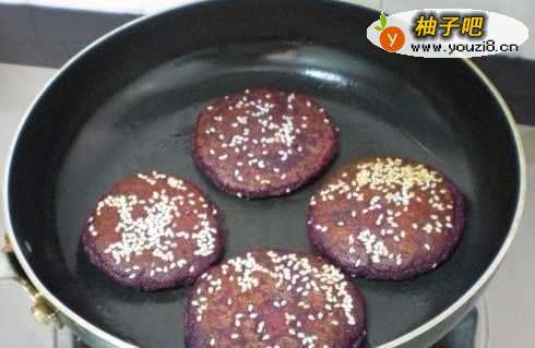 66.平底锅内放油,下入紫薯饼生坯,小火将其煎至两面略黄中间微微鼓起熟透即可.