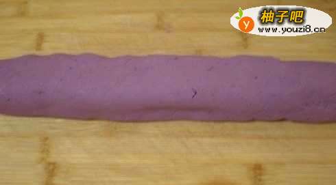 22.将糯米粉、玉米粉与白糖混合,倒入紫薯泥中,再加入适量的水,将其揉成紫色的面团;