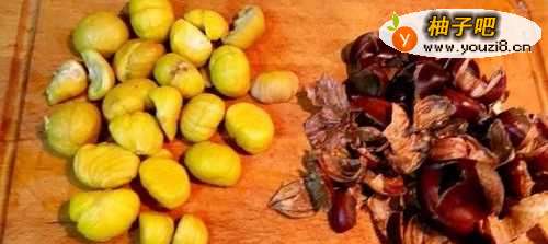 5五分钟后夹出一个剥一个,趁热剥皮,不要一起都捞出来,烫过的板栗非常好剥皮了。