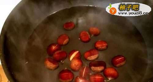 4烧半锅水到沸腾,放一小勺盐,关火、把切好的板栗放进锅里加盖焖烫五分钟。