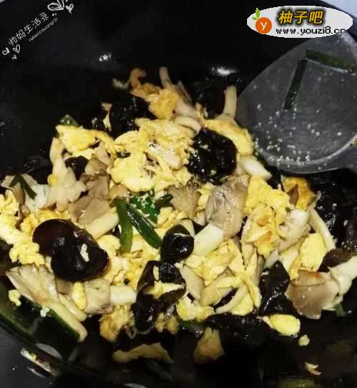 4葱段出香味时,依次加入黑木耳、平菇,翻炒一会,黑木耳入锅之后,就要不断地翻炒,不然黑木耳容易爆,木耳容易熟,翻炒几分钟后,加入少许盐和白胡椒粉。