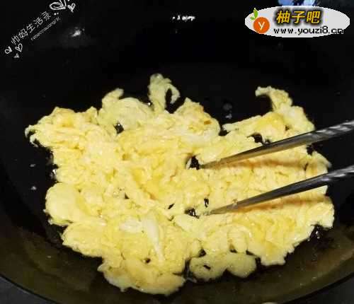 2锅里多放油,油温升高后倒入海鸭蛋液,用筷子划散,全熟后先盛出来。