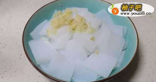 3凉粉盘中放入蒜泥,放入盐,糖