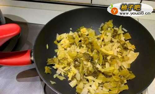 酸菜泡于盐水中约30分钟后,切段或丝,用干锅炒干酸菜水分捞出备用