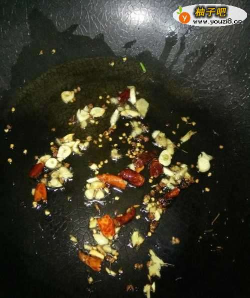 4将多余的油倒出,下辣椒、蒜头、花椒等入锅炒香;