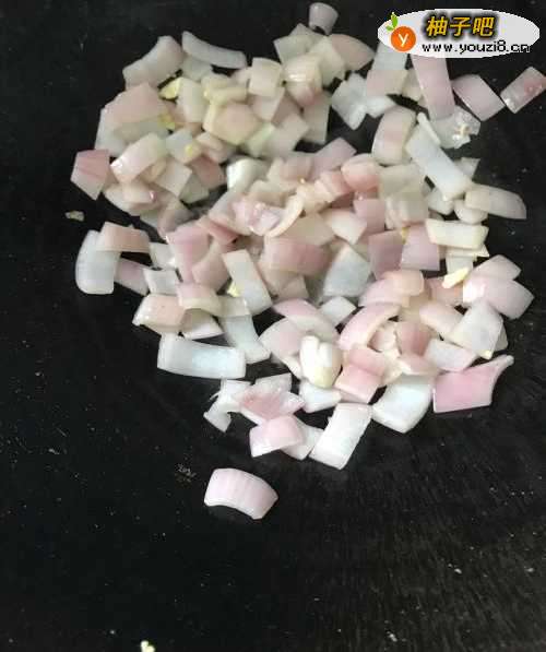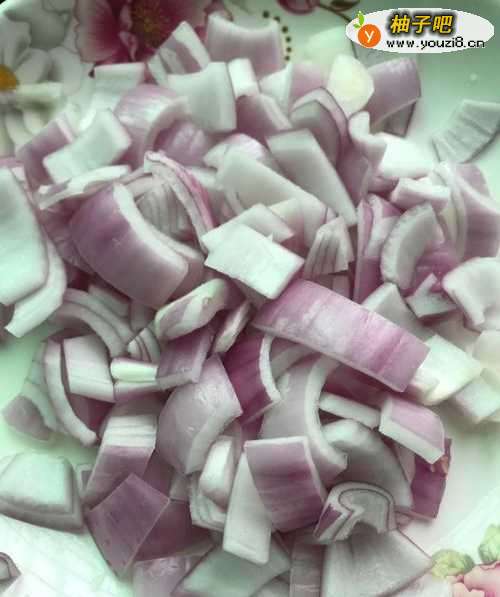 洋葱洗净切小块,鸡蛋打到碗里搅拌均匀。