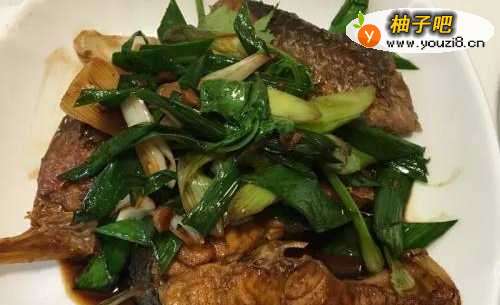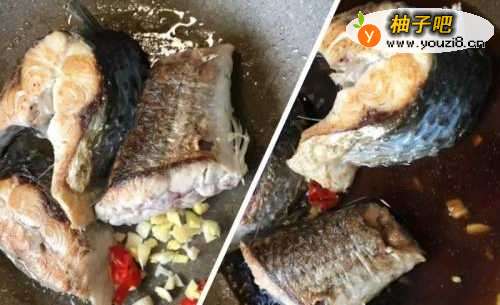5放入蒜末、姜末、辣椒末,闻到蒜香味时就可加入酱油、少许糖和清水,盖上锅盖烧至汤汁稍稍收干,期间须将黑鱼翻面