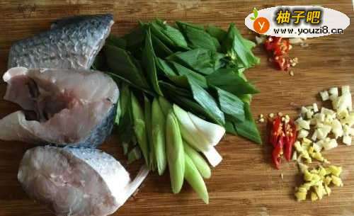 准备食材,青蒜一根洗净斜切小段,蒜头、辣椒、姜切末,黑鱼洗净切块
