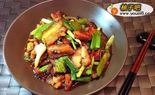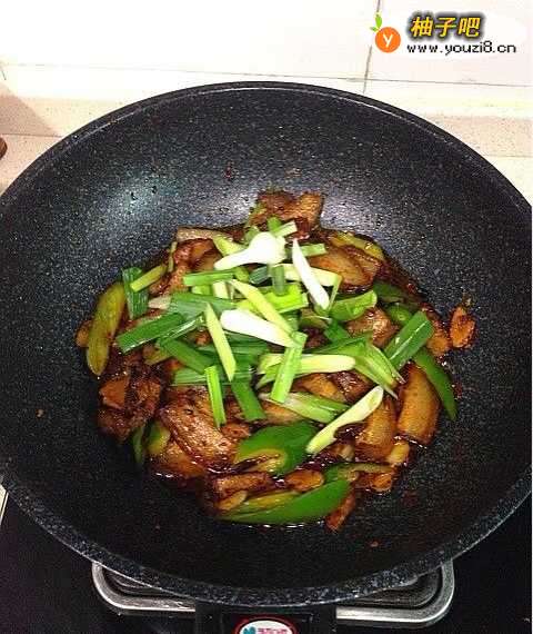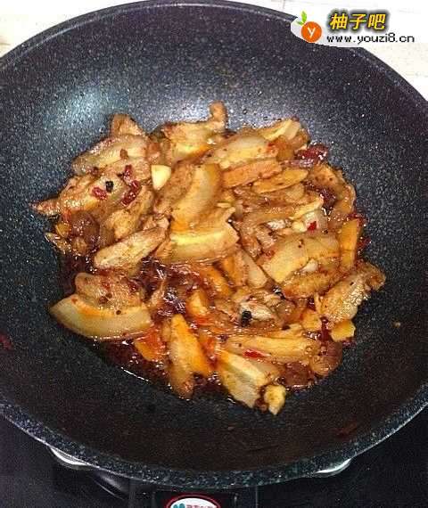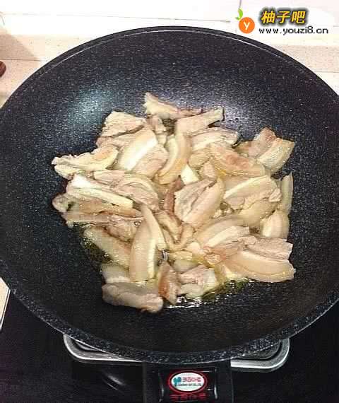 5锅里烧油,油温八成热时下熟五花肉片爆得颜色转变,逼出肥肉的部分油脂。建议此菜大部分使用中小火,慢慢让肉充分吸收各种配菜的美味。