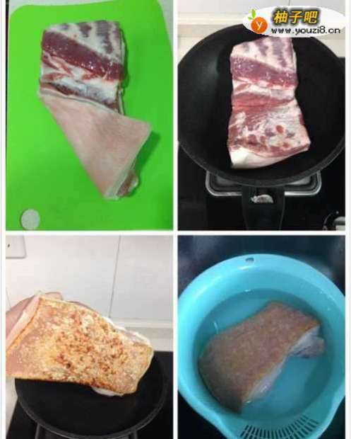 炒锅置灶上,开火,锅烧得极热。新鲜五花肉放锅里烙得肉皮焦黄,放冷水里浸泡后刮洗干净。