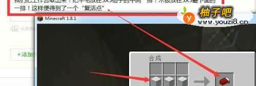 我们把工作台取出来!把羊毛放在3X3格子的中间一排!木板放在3X3最下面的一排!这样便得到了一个“复活点”。