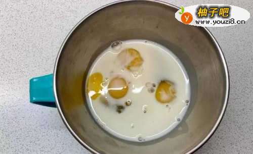 2鸡蛋打散,加入奶油、牛奶和糖,打成蛋液