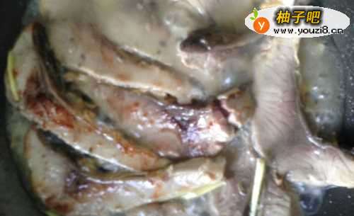 2平底锅烧热,放油,把鱼片一片放进去小火煎,把姜放在鱼面上。待鱼片煎得微黄,就可以翻面煎。