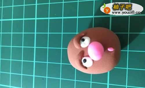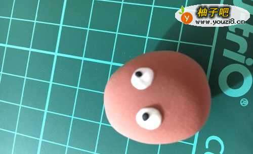 首先选取棕色的泥揉成椭圆形,用白色的泥做出眼白的部分,用黑色粘土做出眼球的部分,注意眼球放置的位置