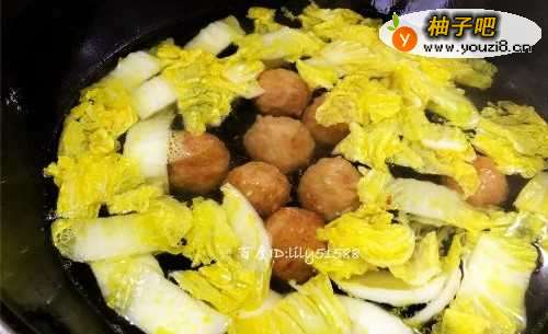 4在炒过白菜的锅里加入适量的开水,放入姜末和丸子一起煮5分钟。
