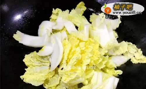 3烧热锅放油,把白菜先放入锅里,用大火炒1分钟。