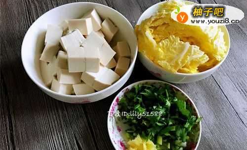 2把白菜、香菜、葱、姜、嫩豆腐洗干净,把嫩豆腐切成正方形的小块,白菜切段,香菜葱切成丁,姜切成末。