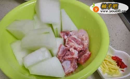 将冬瓜去皮洗净切成大块,排骨洗好,姜切丝,少许枸杞备用。