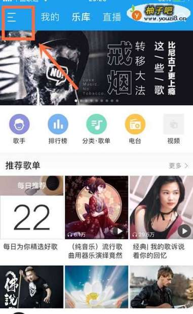 打开手机上的酷我音乐,进到首页,点击右上角的“三横”图标。