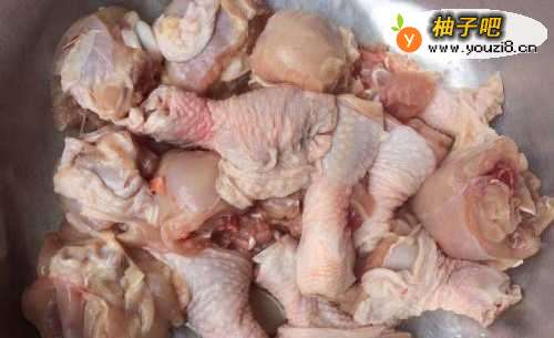 2鸡腿剁成两块,泡入水中半小时清洗几次