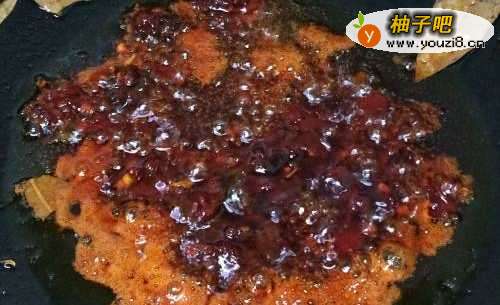 6糖色炒后放入郫县豆瓣酱炒出香味来