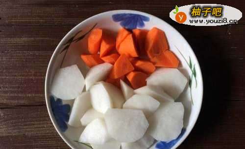 红萝卜、白萝卜去皮均切成滚刀块备用