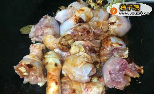 7再把鸡腿块放入转大火翻炒几下,加入生抽3匙白酒1匙及少许胡椒粉并倒入两碗水煮开关火