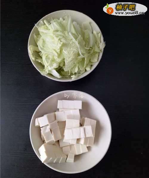 备好食材:嫩豆腐洗净,切小方块;白菜洗净,撕碎;再备点姜片:老姜洗净,切片;