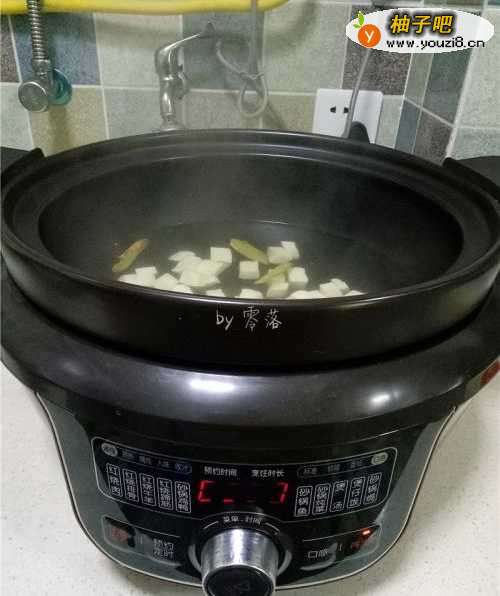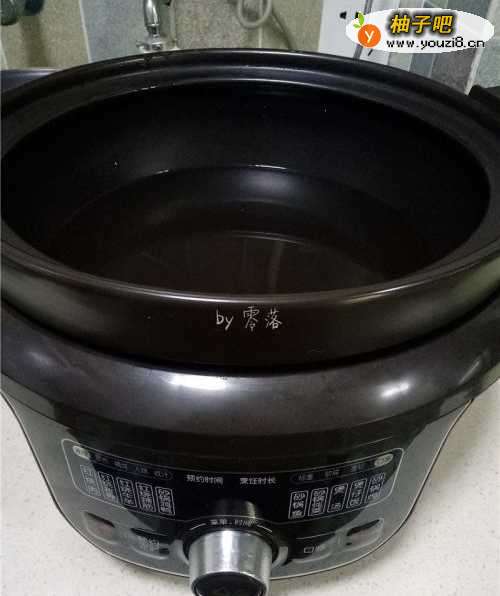 3电砂锅里倒入适量清水;放入姜片;接通电源,启动“再加热”功能,将清水烧开;