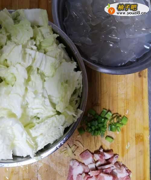 首先是食材准备工作:一张粉皮掰小块温水泡发,白菜清洗切小块,五花肉切小块,适量葱和姜切好备用。